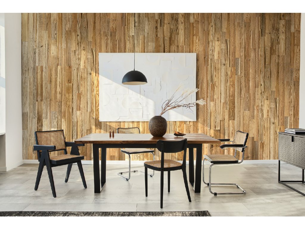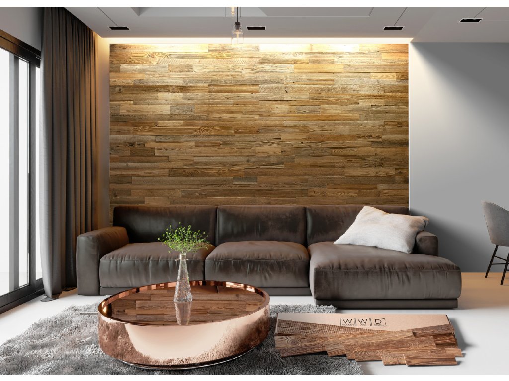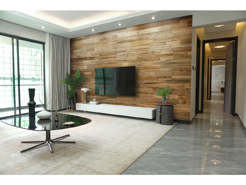 - Obklad na stenu vyrobený z kartáčovaného recyklovaného dreva