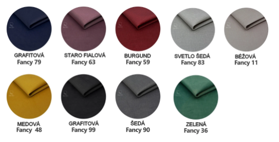 V našej ponuke predstavujeme viaceré kolekcie látok pre čalúnené panely — Fancy, Soft, Kronos, Manila, Magic Velvet, Mono — pričom každá z nich má ďalej rozpracované množstvo odtieňov a farebných variant.