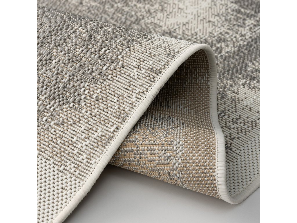 Obdĺžnikový tvar koberca a jeho rozmery 160x230 cm ho robia ideálnym do obývačky, spálne alebo salónu. Má svetlé odtiene béžovej, ecru a sivej, ktoré vytvárajú jemný, abstraktný vzor s jemnými tónovými prechodmi. Vzor pripomína nepravidelné ťahy alebo pretínajúce sa roviny, čo celému kusu dodáva moderný, no zároveň decentný charakter. Plocho tkaná štruktúra zdôrazňuje minimalistickú estetiku a všestrannosť koberca.