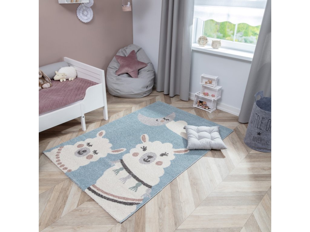 Koberec do detskej izby zdobený roztomilými lamami. Vďaka polypropylénovej priadzi má antialergické a antistatické vlastnosti.