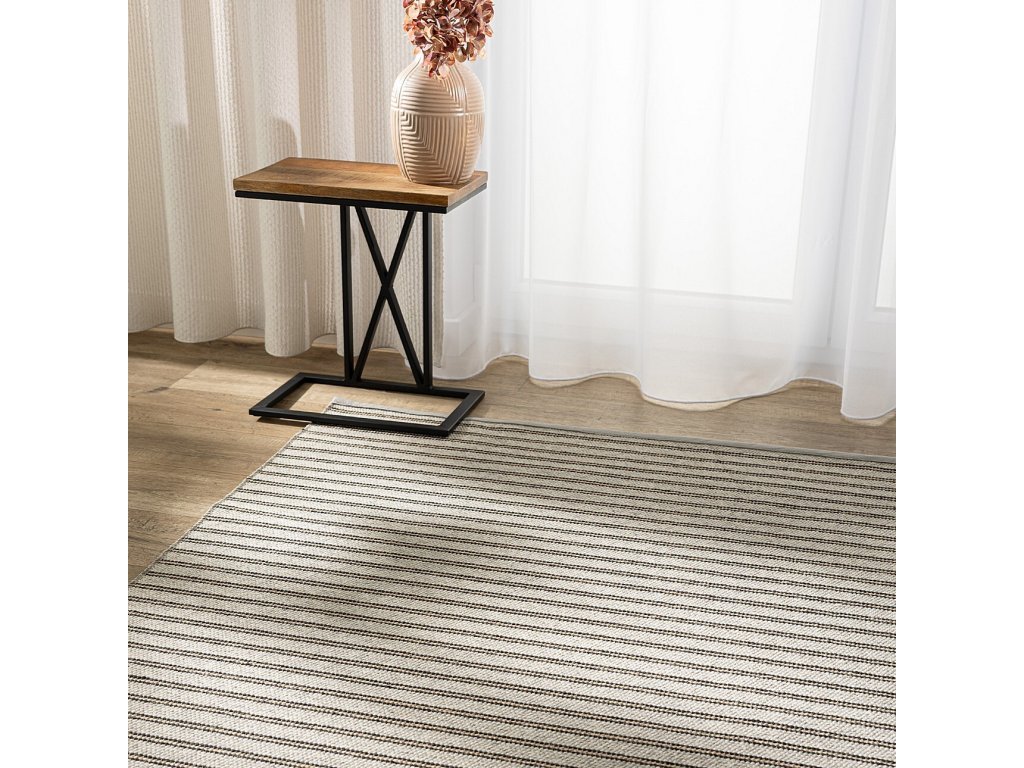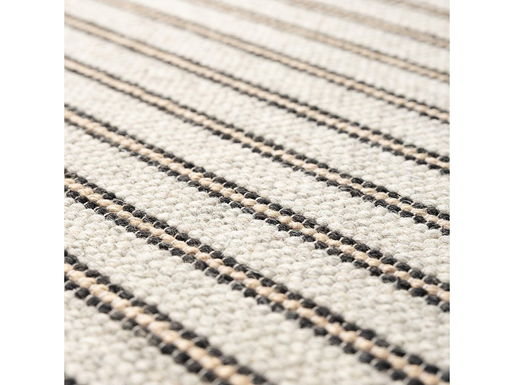 Koberec Harmony kombinuje nadčasovú estetiku s prírodnými materiálmi. Svetlý, melanžový základ je doplnený jemnými, pravidelnými pruhmi v čiernej a béžovej farbe, ktoré vytvárajú rytmus a vizuálnu ľahkosť. Jednoduchý, pruhovaný vzor robí koberec výrazným a zároveň všestranným.