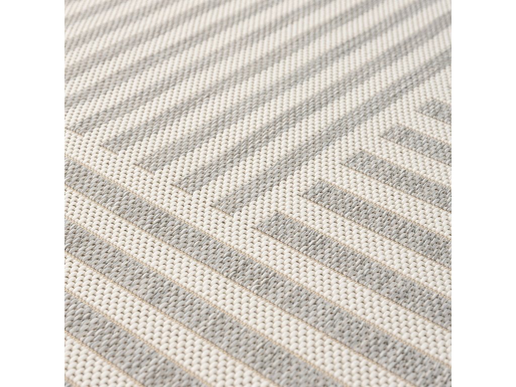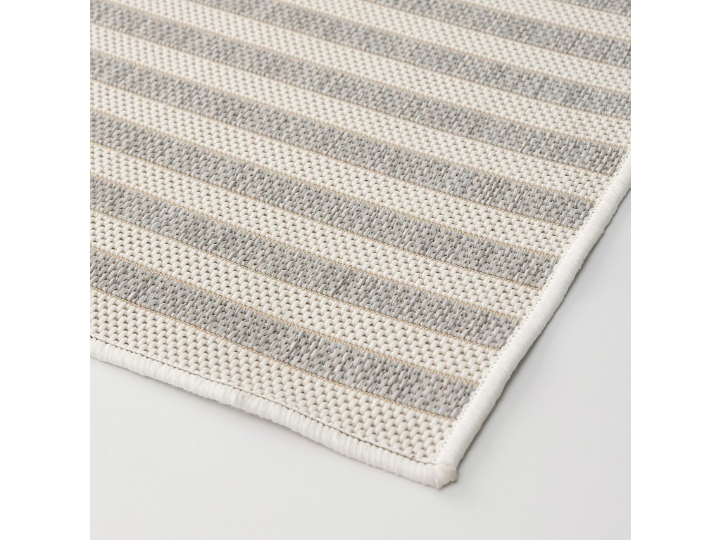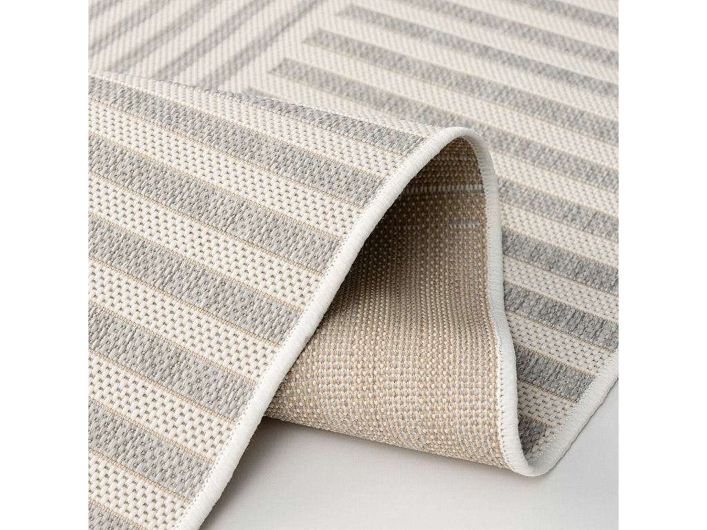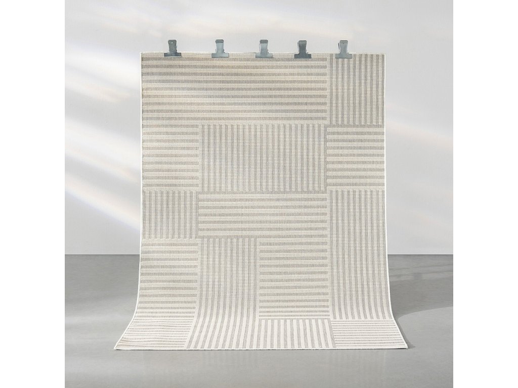 Koberec je obdĺžnikový a má rozmery 160x230 cm. Má svetlú farebnú schému kombinujúcu odtiene ecru a jemnej sivej. Geometrický vzor, zložený z pruhov v rôznych smeroch, vytvára pokojnú, rytmickú kompozíciu, ktorá dodáva interiéru štruktúru a zároveň zostáva vizuálne nenápadná. Plocho tkaný povrch zaisťuje, že koberec dobre priľne k podlahe a je ideálny na každodenné použitie.