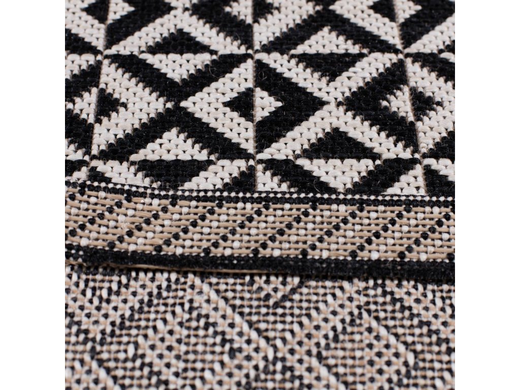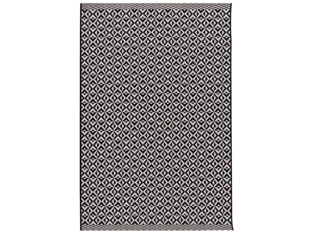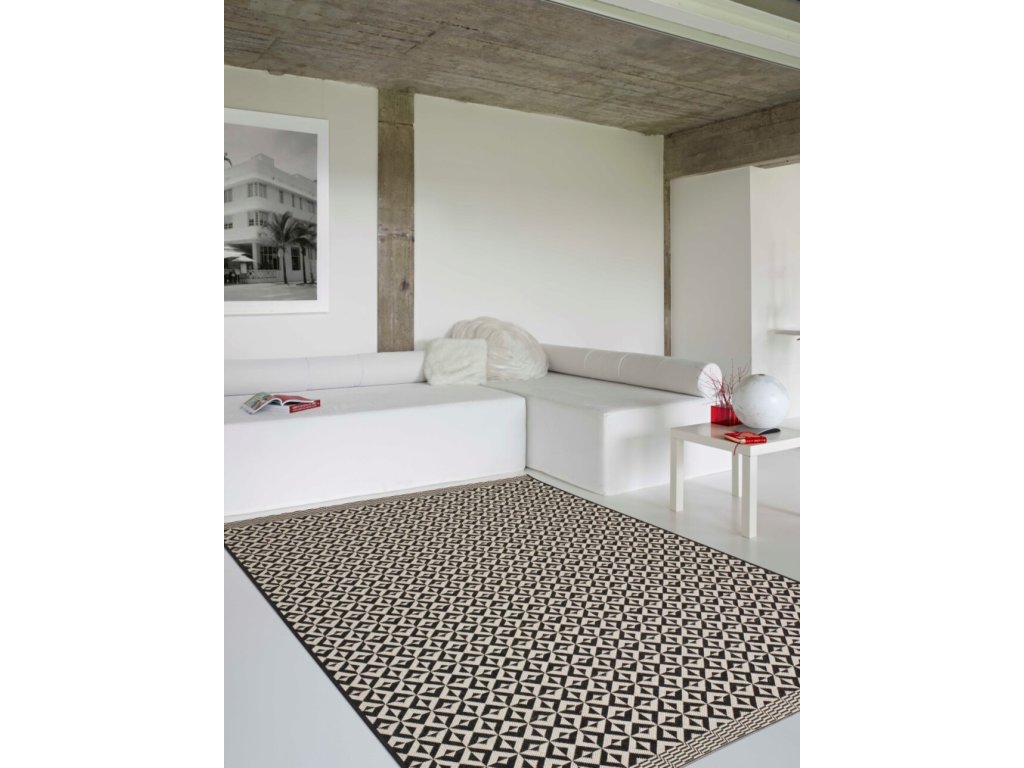Koberec so zaujímavým, geometrickým vzorom v jemnej čierno-béžovej farbe. Je určený na vnútorné aj vonkajšie použitie a je ideálny do obývacích izieb, spální, chodieb a dokonca aj na terasy. Vďaka svojmu neutrálnemu dizajnu a jemnému vzoru sa hodí do širokej škály interiérov.