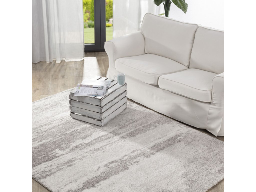 Moderný koberec s minimalistickým vzorom, v prepletených odtieňoch sivej a krémovej, lemovaný sivou niťou. Zahreje a vnesie farbu do každého interiéru, čím mu dodá jedinečný charakter a štýl. Tento koberec má jedinečný a nadčasový dizajn, ideálny do obývačiek aj detských izieb.