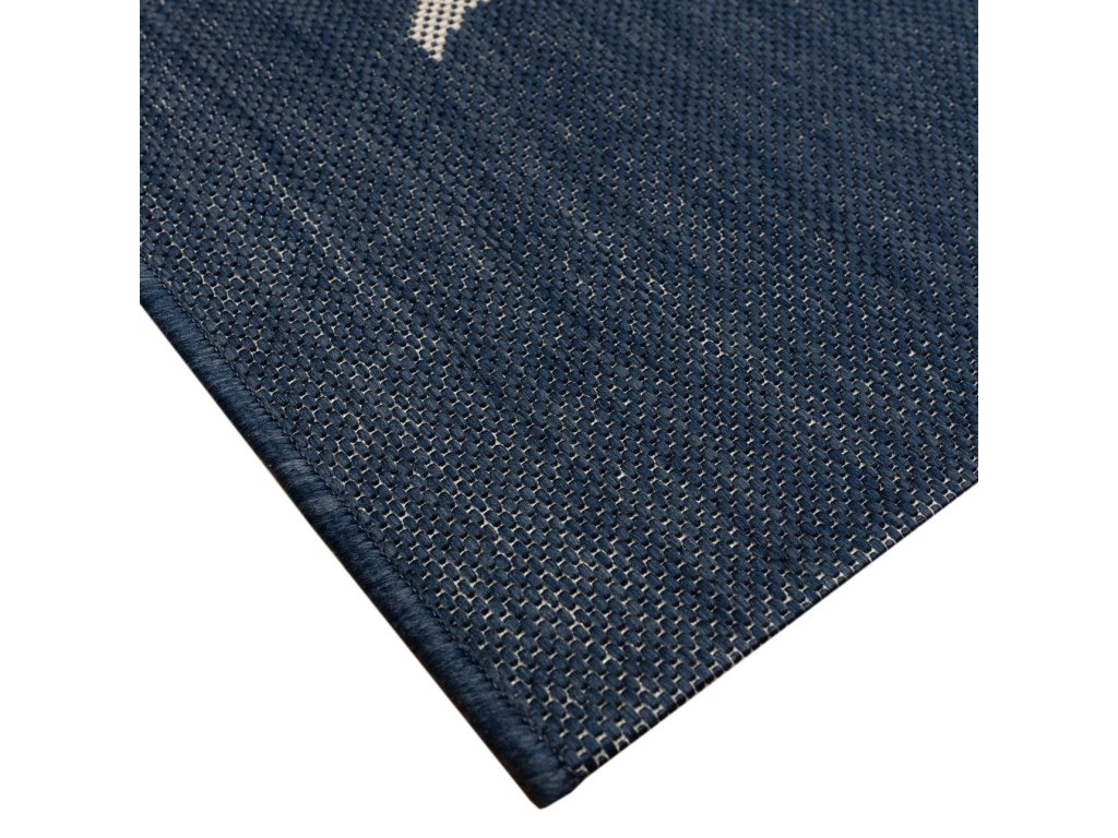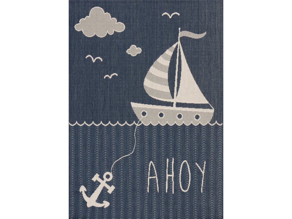 Moderný tmavomodrý koberec do detskej izby s motívom plachetnice plávajúcej po mori a spúšťajúcej kotvu. Kombinácia béžových akcentov na tmavomodrom pozadí dokonale doplní izbu vášho drobčeka. Tento ľahko čistiteľný koberec sa stane nepostrádateľným miestom pre deti, kde budú robiť prvé krôčiky alebo sa spolu hrať.