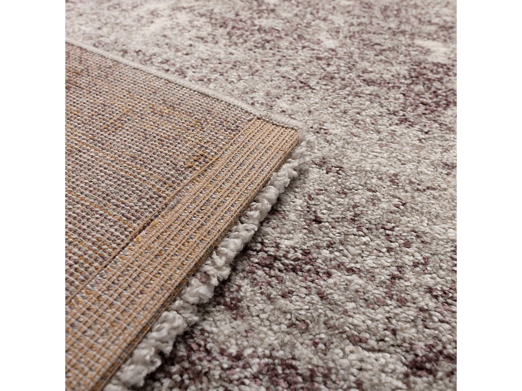 Koberec Softness má univerzálny dizajn v sivej a striebornej farbe s bordovým akcentom.