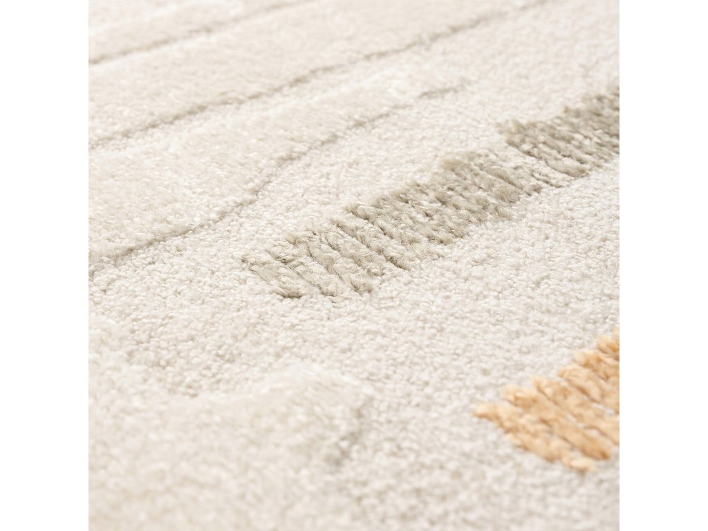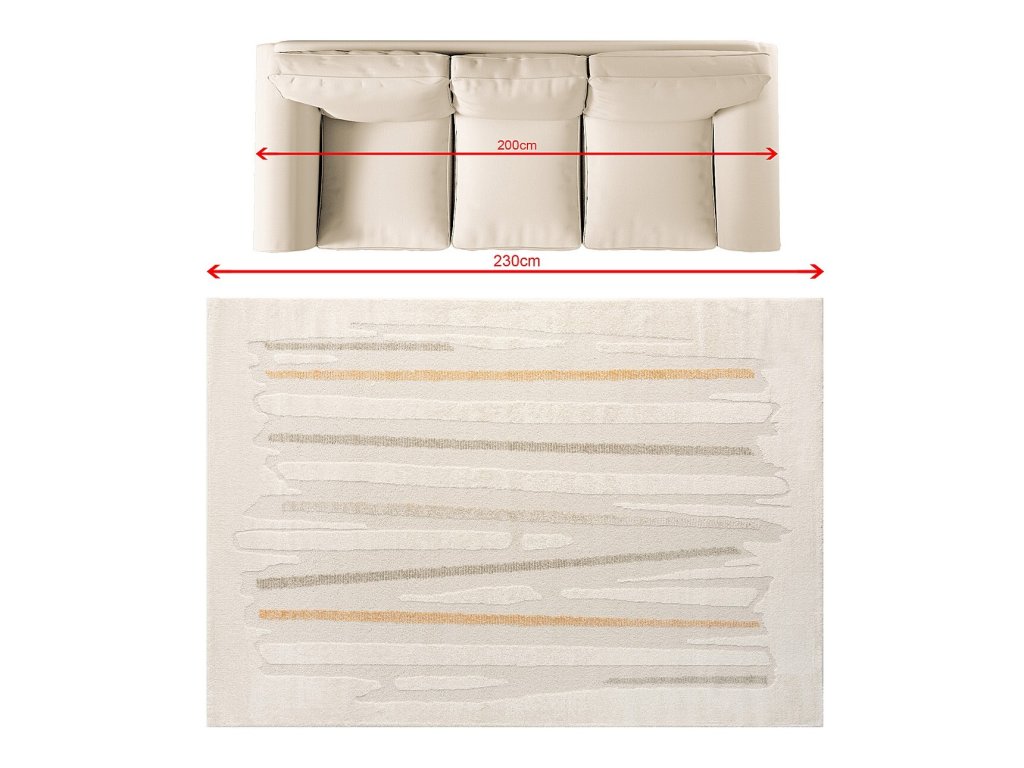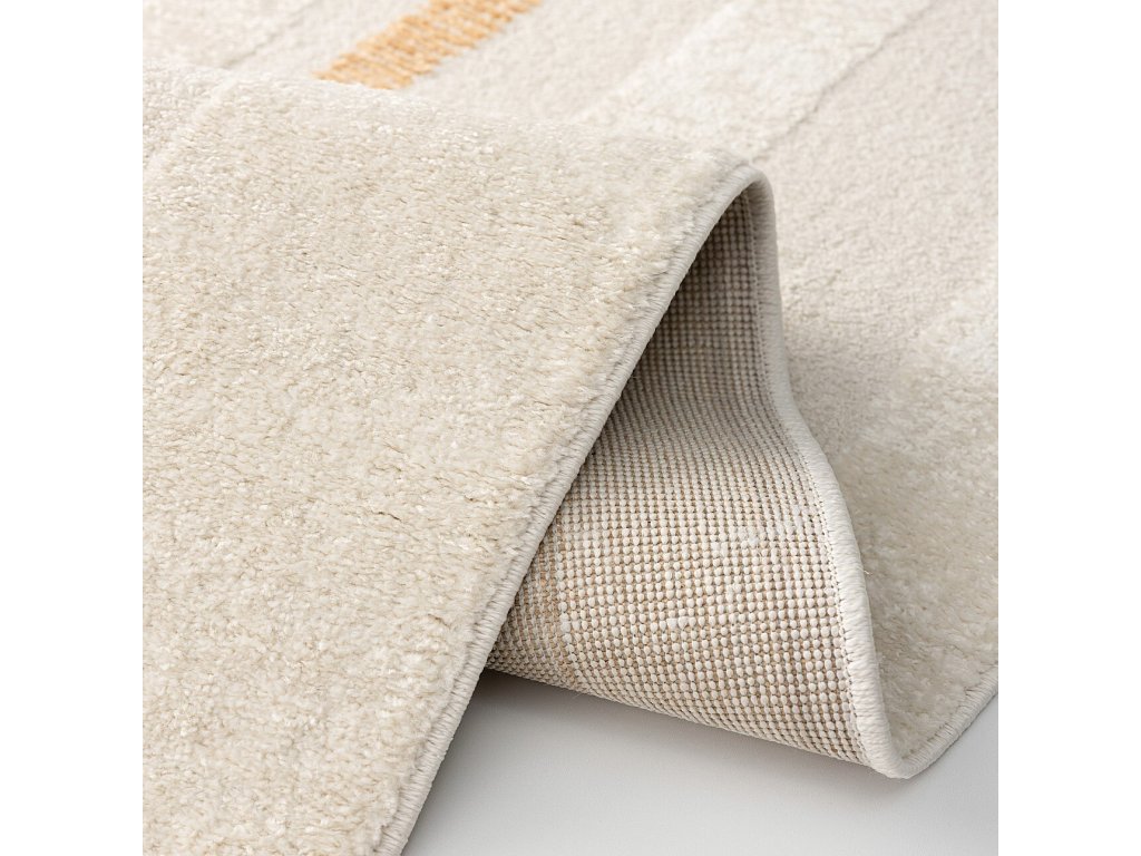 Obdĺžnikový tvar koberca a jeho rozmery 160x230 cm ho robia ideálnym do obývačky, spálne alebo salónika. Má svetlú, neutrálnu farebnú schému – dominantné odtiene béžovej, krémovej a svetlosivej, doplnené jemnými akcentmi v teplom, medovom tóne. Vzor pozostáva z nepravidelných, zvislých pruhov s rôznymi textúrami, ktoré celému kusu dodávajú moderný, mierne umelecký charakter. Povrch koberca je mäkký a príjemný na dotyk, s jemnými variáciami vo výške vlasu.