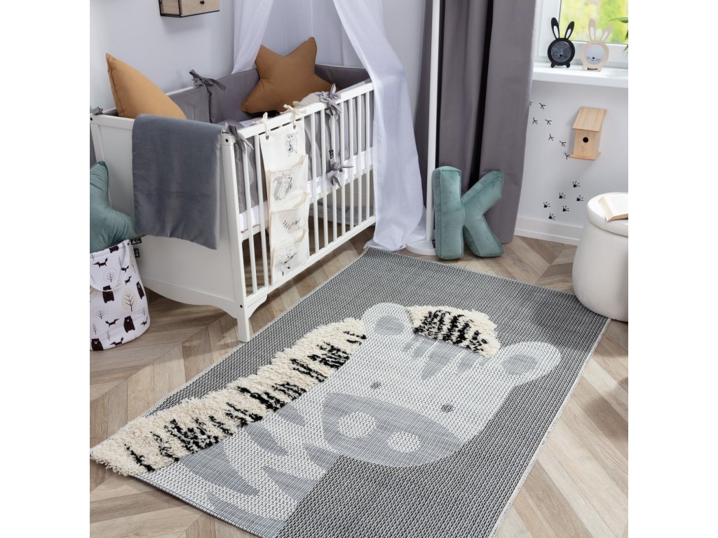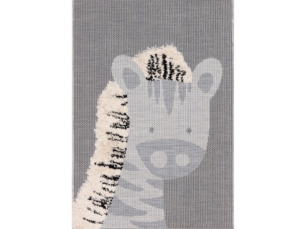 Šedomodrý koberec do detskej izby s motívom zebry a mäkkou hrivou.